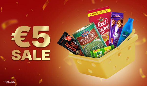 Get delicious and essential items like Parle biscuits (Black Bourbon, Hide & Seek), TRS Sarson Ka Saag, Red Label tea, Parachute coconut oil, and much more — all for just €5 each.